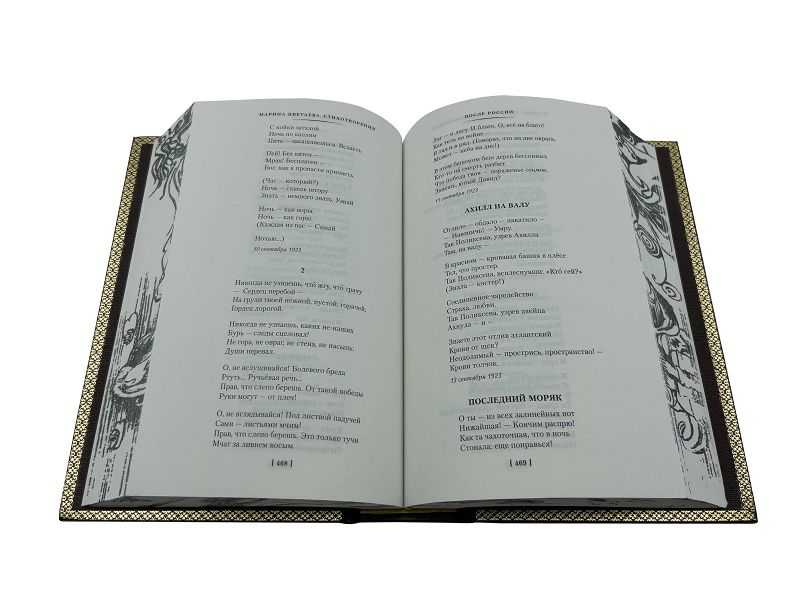 Предлагаемое подарочное издание содержит избранные произведения великого русского поэта М. И. Цветаевой. Книга имеет кожаный переплёт коричневого цвета. Обложка украшена фотопортретом автора. Издание имеет цветные форзацы и шёлковые ляссе и каптал. На обрез нанесена гравюра.