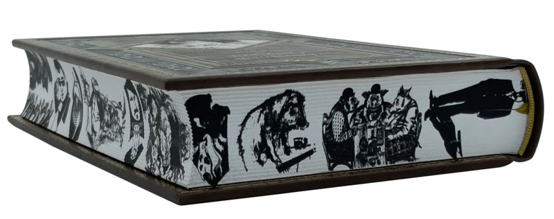 На обрезе изображены гравюры, иллюстрирующие моменты из романов. Таким образом украшенная книга сама станет украшением интерьера. Форзацы цветные, а сама обложка - кожаная. Что сулит долговечность. Ведь не зря в древности книги переплетали именно таким образом.