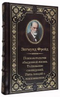 Книга выполнена в великолепном кожаном переплете, обрамленном резным орнаментом. Обложка украшена портретом Фрейда в золотой рамке, а обрез книги создан в виде темного мрамора. Форзацы в черном цвете, а также каптал и ляссе из шелка делают вид издания еще более роскошным.
