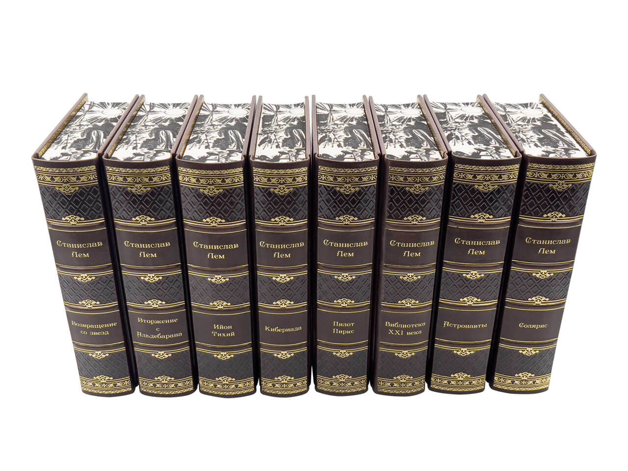Эксклюзивное подарочное издание восьми томов в цельнокожаном переплете с золотым тиснением - достойная дань великому писателю. Оно станет предметом гордости для ценителей таланта Лема и шедевров фантастики.